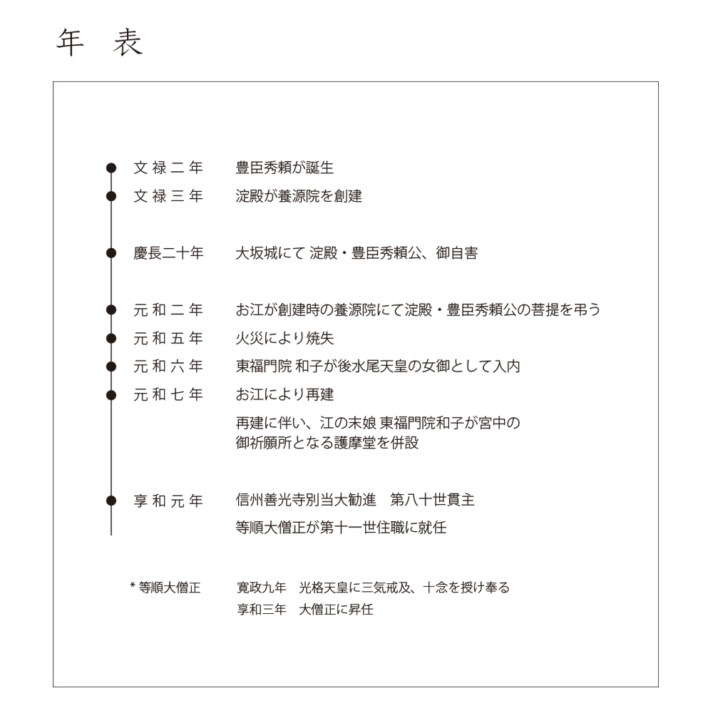 養源院は文禄三年(一五九四)戦国武将であった浅井長政の菩提を弔うために、長政の二十一回忌に長女·淀殿 (幼名茶々)の願いにより、豊臣秀吉によって建立されました “養源院”の寺名は長政の法号から来ています。その後、元和五年 (一六一九)に火災に遭い焼失しましたが、二年後には淀殿の妹·崇源院(長政三女) によって再建されました。現在の本堂は再建時の姿を留めているといわれます。養源院ゆかりの浅井長政は、戦国時代に滋賀県の北部を領地とした大名でした。